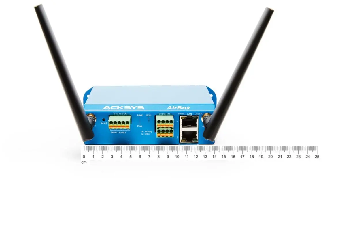 AirBox embedded intelligence simplifies the network design and does not require any wireless LAN controller. Administration is centralized via ACKSYS WaveManager software. Network is secured thanks to AirBox high level of security (Firewall, VPN, 802.1X …). Two pairs of digital I/O are controllable with the SNMP protocol to operate remote equipment or read the logic state of a signal.
