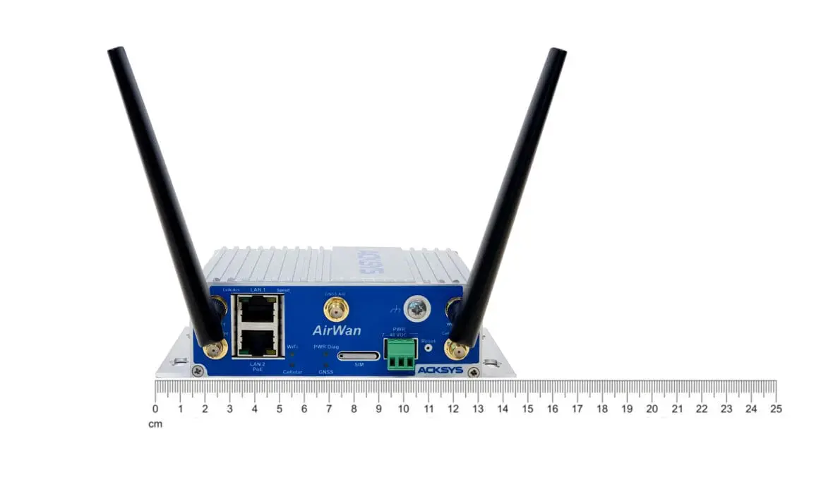 AirWan is a cellular router (2G/3G/4G LTE) equipped with a dual-band WiFi interface (2.4 / 5 GHz), a GNSS interface (GPS, Galileo, GLONASS, Beidou), 1 Giga Ethernet and 1 Fast Ethernet ports. It is designed for industrial applications (industry 4.0) and mobility (buses, vehicles …).